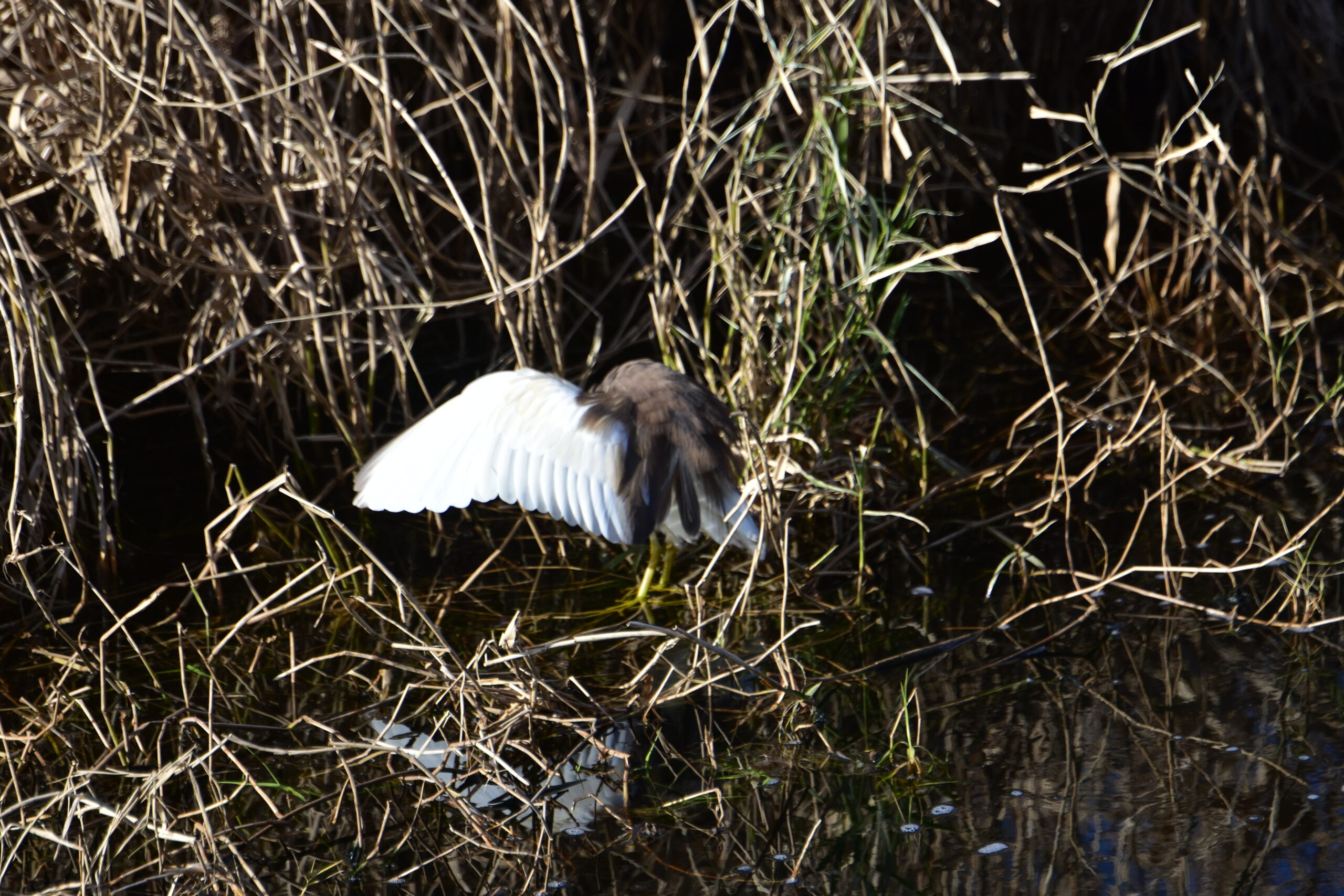 アカガシラサギ境川岸の枯れ葦の中で羽繕いしています。