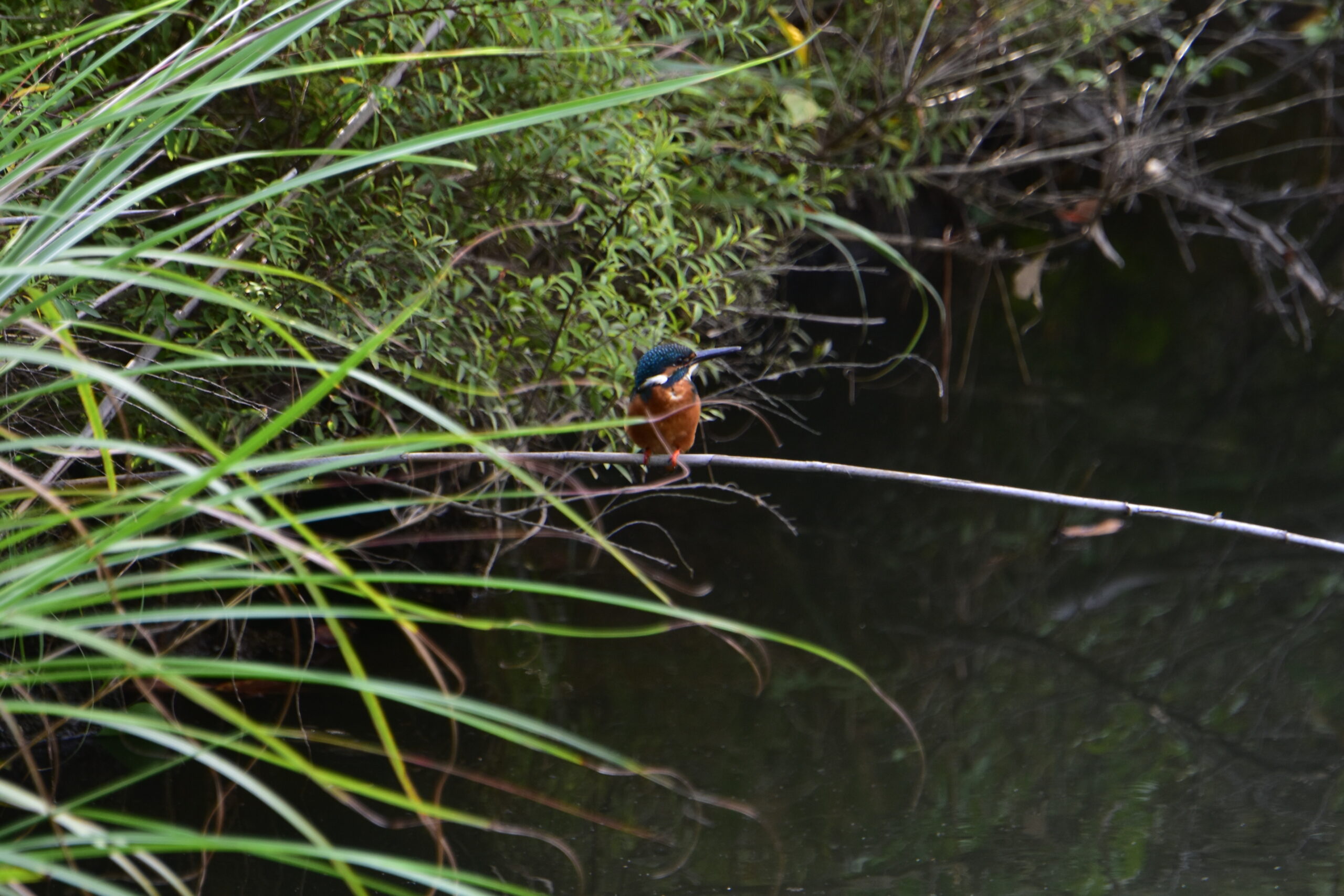 カワセミ小島の葦に止まる。 野鳥 Twitter Facebook はてブ Pocket LINE コピー 2025.09.23 9月23日午前8時30分過ぎ、カワセミ若オス、福田公園の小島の葦に止まり休息しました。
