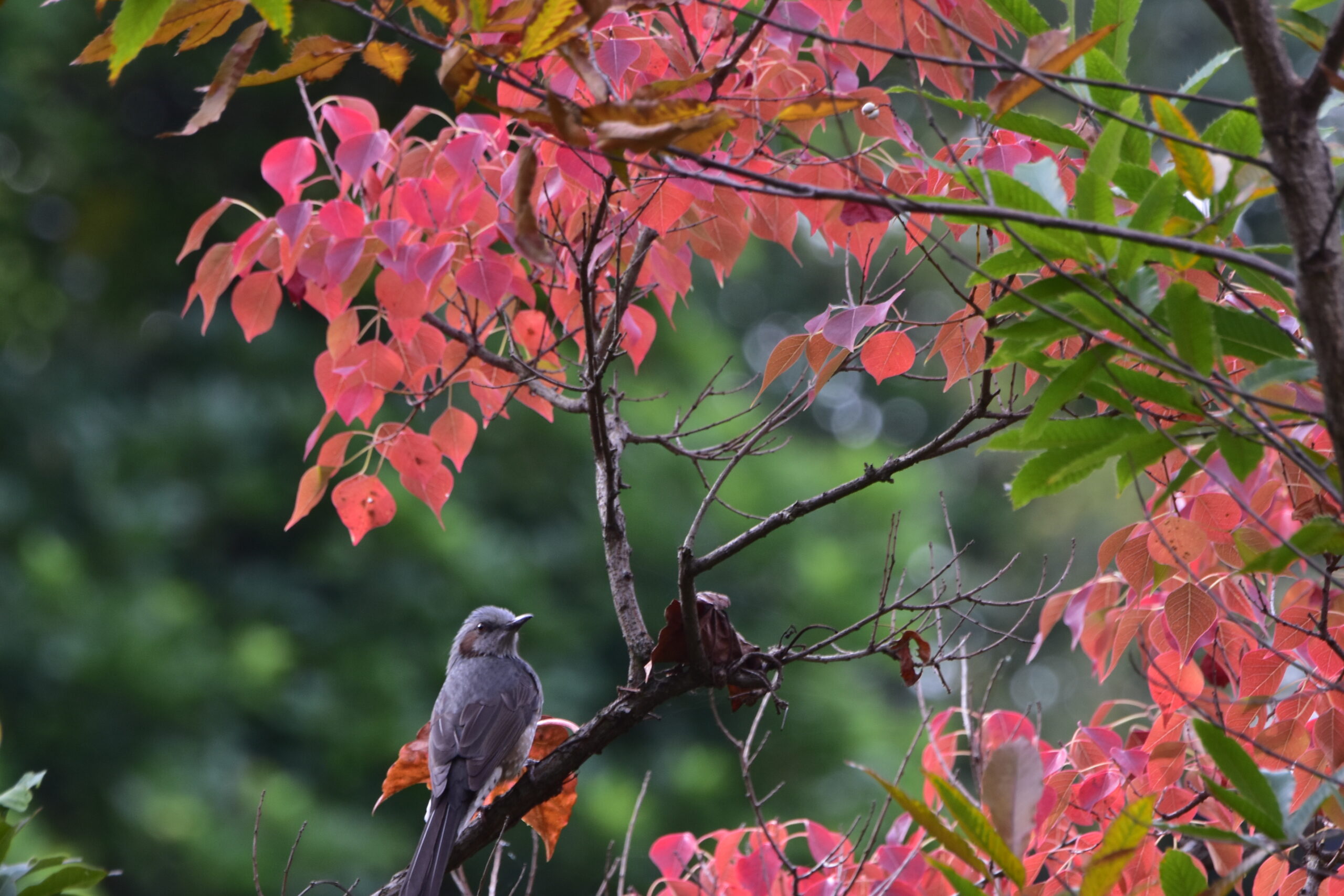 ヒヨドリ紅葉した南京ハゼに止まる。 野鳥 Twitter Facebook はてブ Pocket LINE コピー 2025.10.31 10月31日午前8時45分過ぎ、ヒヨドリ紅葉した南京ハゼに止まる。