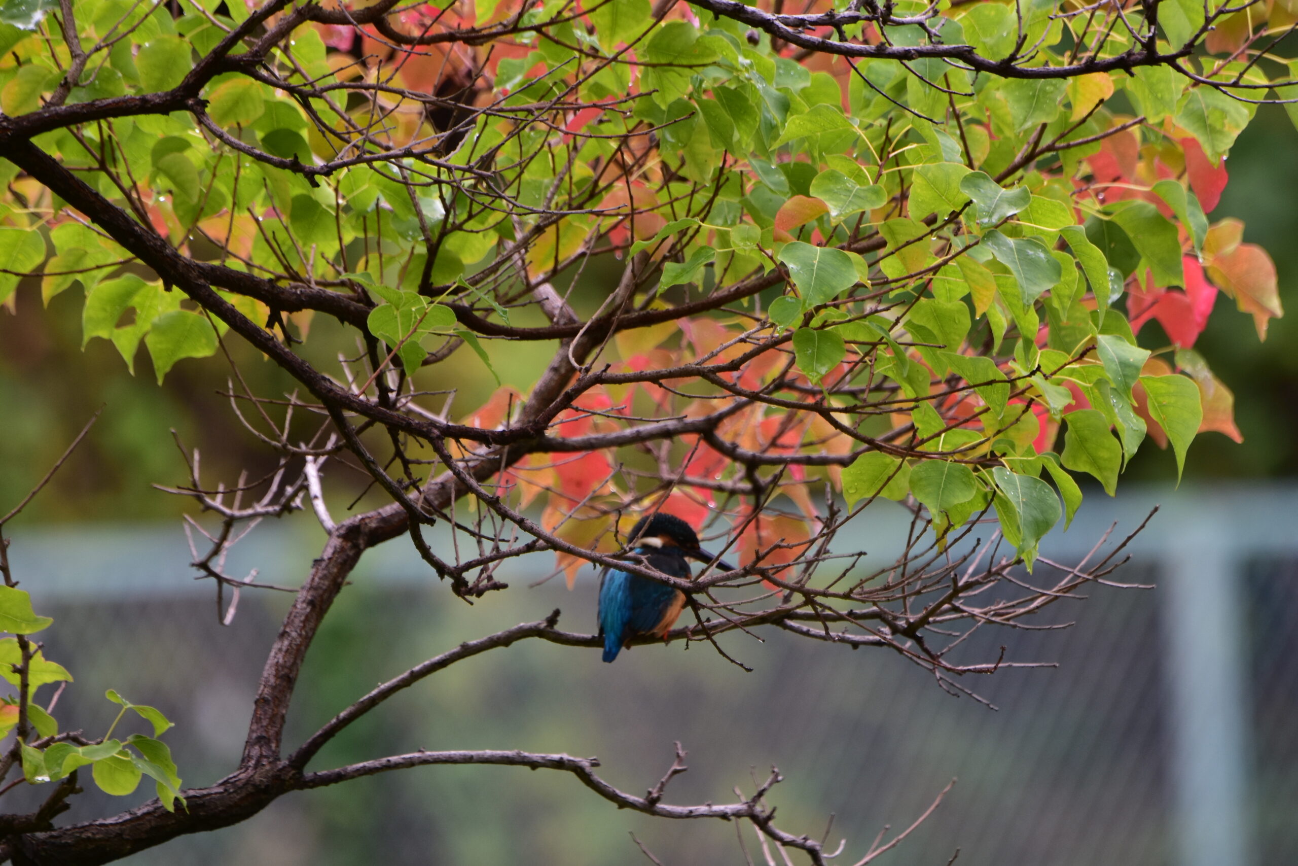 紅葉した南京ハゼにカワセミ(オス)止まる。 野鳥 Twitter Facebook はてブ Pocket LINE コピー 2025.10.15 10月15日午前8時50分過ぎ、カワセミ(オス)福田公園調整池の南京ハゼに止まる。