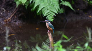 野鳥の森の蓮池にカワセミ(若いメス)来ました。