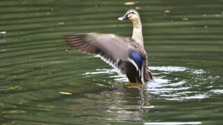 10月15日午前8時過ぎ、福田公園の調整池に5羽のカルガモが飛来し、すぐ羽ばたきを始めました。