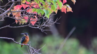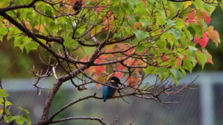 紅葉した南京ハゼにカワセミ(オス)止まる。