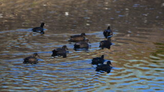 野鳥 境川に・オカヨシガモ8羽・オオバン2羽が群れになっています。