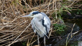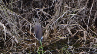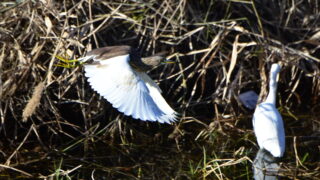 1月12日午前9時20分過ぎ、河川敷の枯れた葦原で休憩中のアカガシラサギにコサギ接近しました。アカガシラサギ逃げました。
