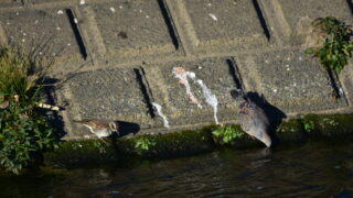 1月24日午前8時40分過ぎ、境川岸でツグミとキジバト仲良く吸水しています。