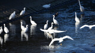 1月8日午前9時10分過ぎ、境川で複数のカワウの後を追う。コサギ・ダイサギの群れが小魚を追い捕食しています。