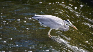 10月5日午前11時過ぎ、アオサギ境川の堰で川魚狙う。近くにコサギも2羽います。