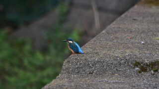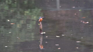 10月7日午前8時30分過ぎ、カワセミ(オス)福田公園調整池岸から小魚狙う。