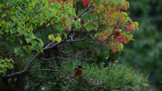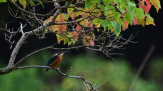 紅葉が始まる。南京ハゼに止まるカワセミ(オス)です。