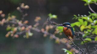 10月12日午前8時過ぎ、福田公園の小島の秋を感じる実の枝にカワセミ止まる。