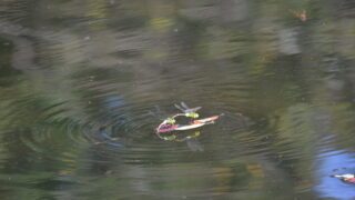 9月11日午前9時過ぎ、福田公園の調整池に落ちた枯葉で、ギンヤンマ産卵する。