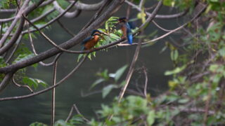 9月15日午前7時50分過ぎ、福田公園調整池の小島に生えるハゼの枝で、若いカワセミ争う。