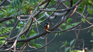 9月1日午前8時過ぎ、福田公園の調整池小島のハゼの枝から、カワセミ小魚狙う!池の水浅くなっている。