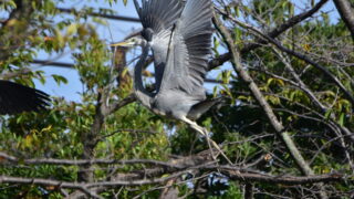9月11日午前7時過ぎ、福田公園の調整池岸桜の木でアオサギ2羽で争う。